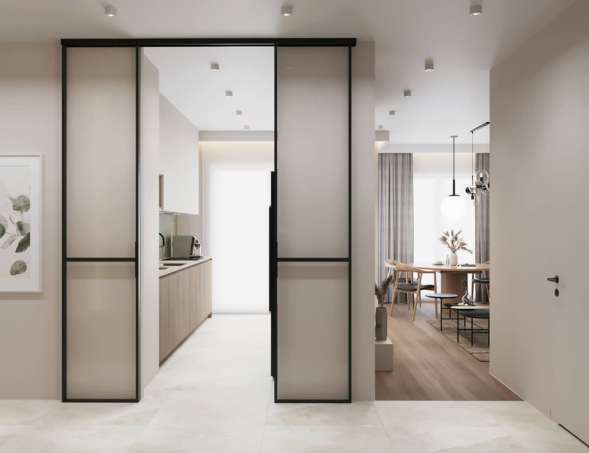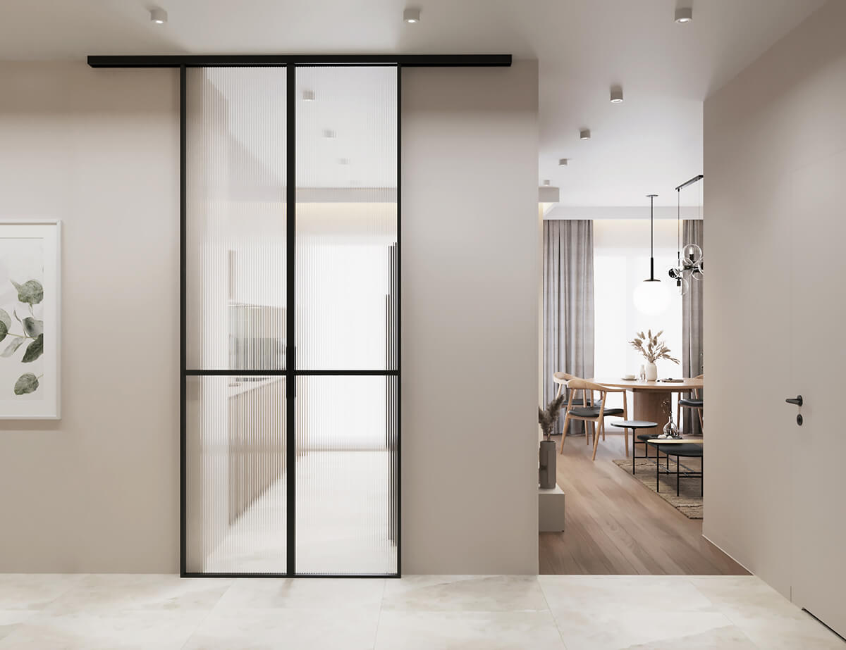 1) Drzwi w kuchni – szkło ornamentowe, profile czarne.