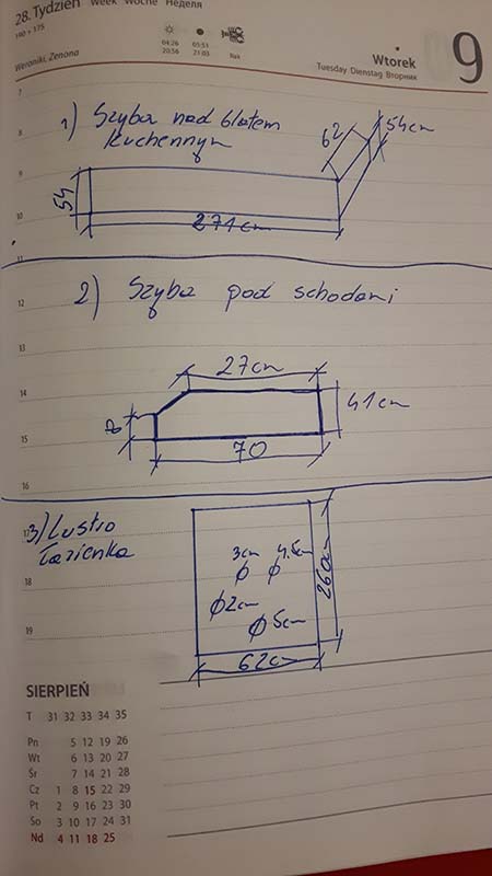 Proszę o wycenę lustra i szyb z załącznika (spis-wymiary) wraz z montażem na Bielanach Wrocławskich .: