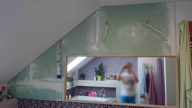1. Łazienka mała – lustro szer 1,80m, wys 1,40m, montaż na całej ścianie widocznej na zdjęciu (tynk maszynowy)
