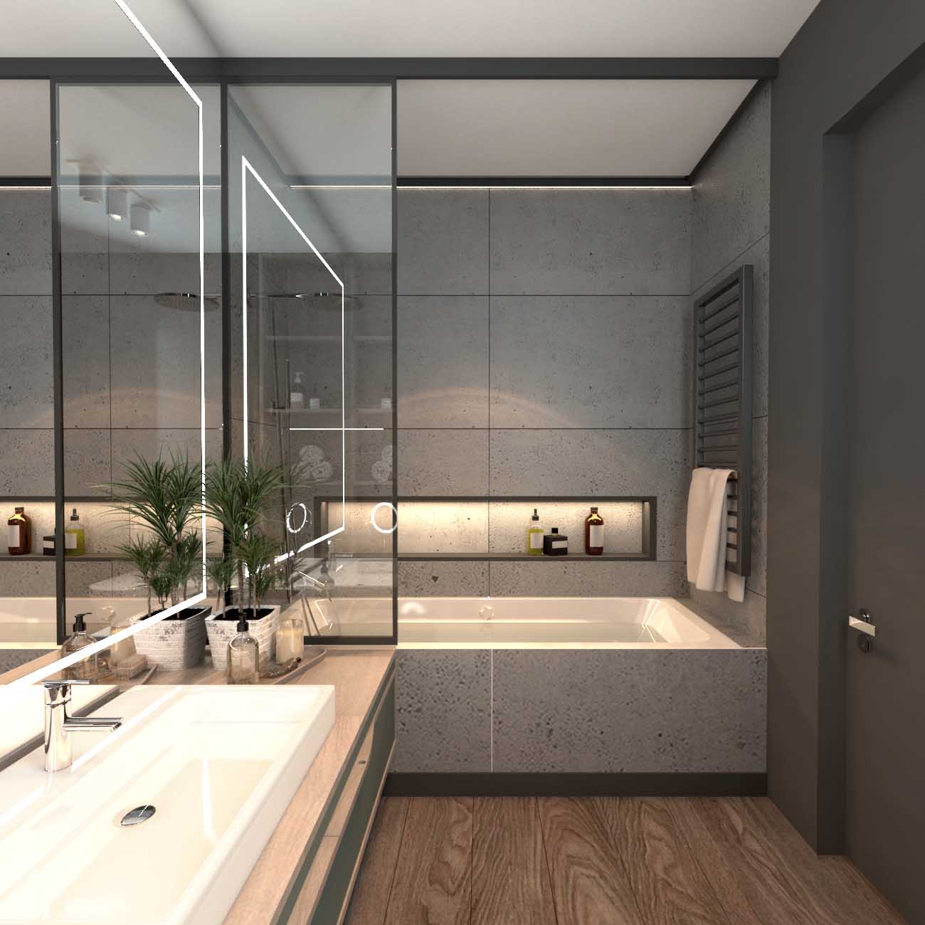 Dodatkowo, możliwe że to ważne, nastąpiła zmiana w zabudowie pokoju kąpielowego – jeszcze nie ma jej naniesionej na pliku pdf, jednak załączam dodatkowe zdjęcia. W narożniku, na łączeniu prostopadłym dwóch ścian będzie ścianka, na której będą znajdowały się włączniki, ścianka będzie miała wymiar 300x75mm, czyli zabudowa z drzwiami przesuwnymi zawęzi się o 300mm, a pod skosem o 75mm.