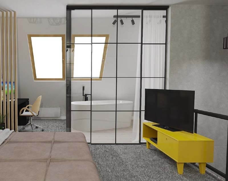 We wszystkich rozwiązaniach oczywiście szkło przezroczyste. Oczywiście wygląd poszczególnych elementów może różnić się końcowo od tego przedstawionego na wizualizacji – tak jak pisałam prace nad projektem jeszcze trwają, więc możemy je znacznie uprościć.